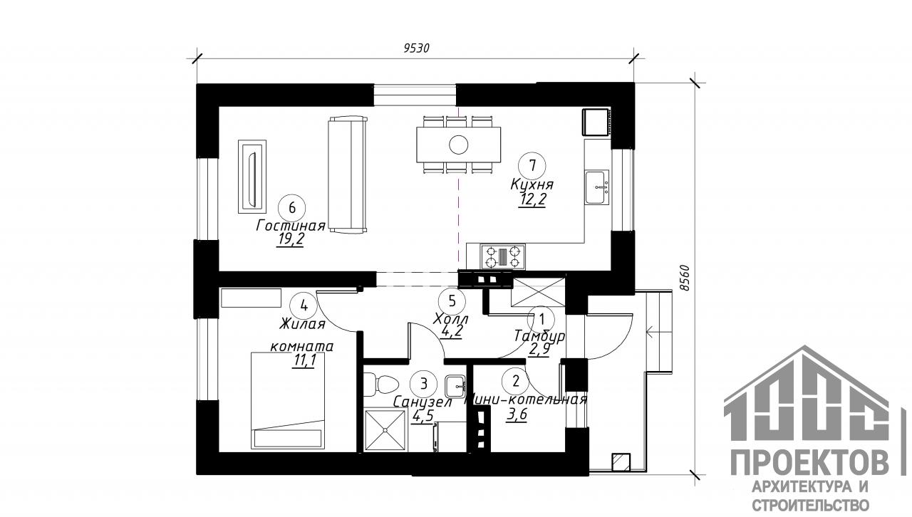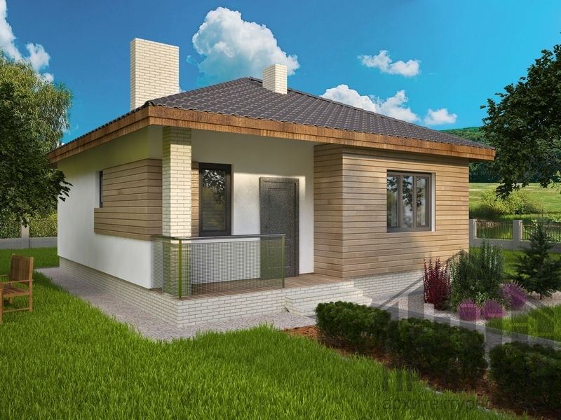 Проект одноэтажного дома из газосиликатных блоков площадью 57,7м2. В проект включены жилая комната, гостиная, совмещенная с кухней и санузел.