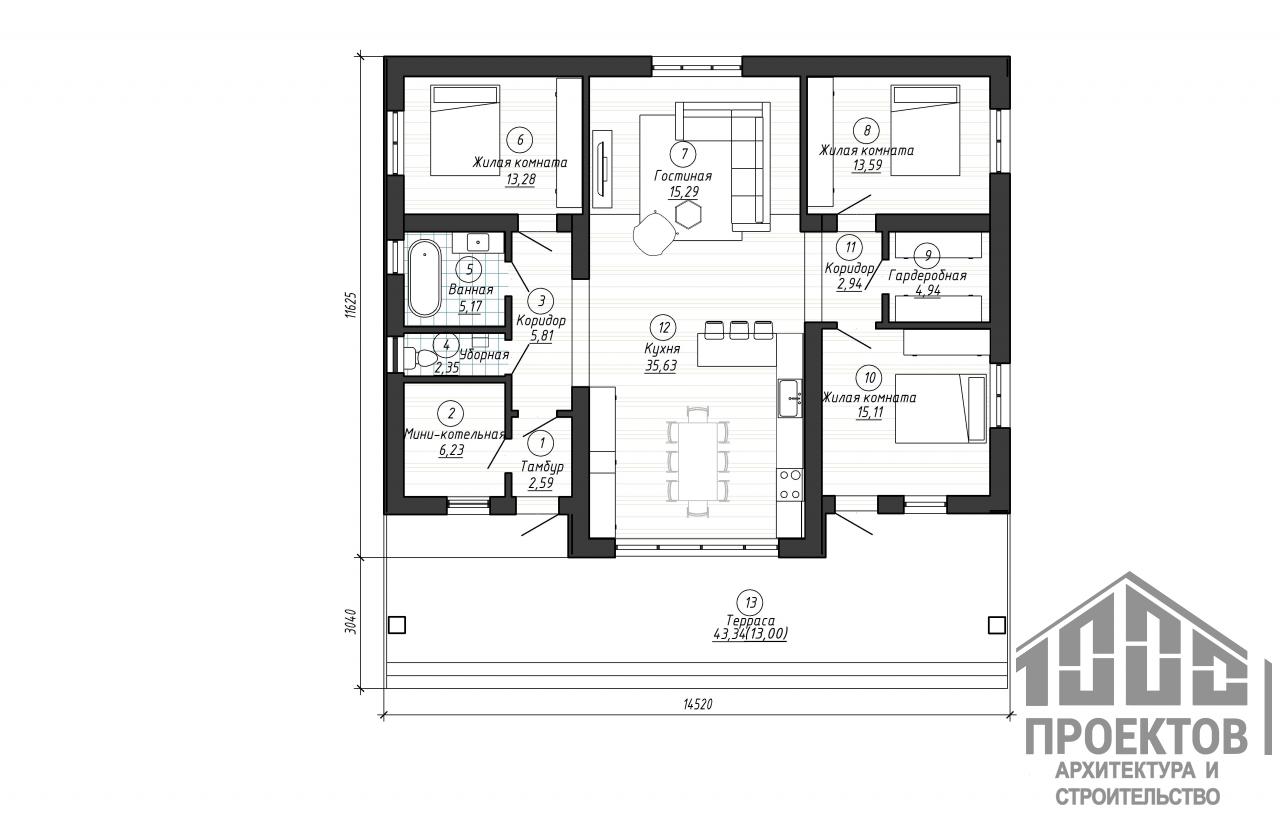 Проект одноэтажного дома из газосиликатных блоков площадью 165,93 м2. В проект включены 3 жилые комнаты, просторная гостиная, совмещенная с кухней, раздельный санузел, гардероб и уютная терраса.