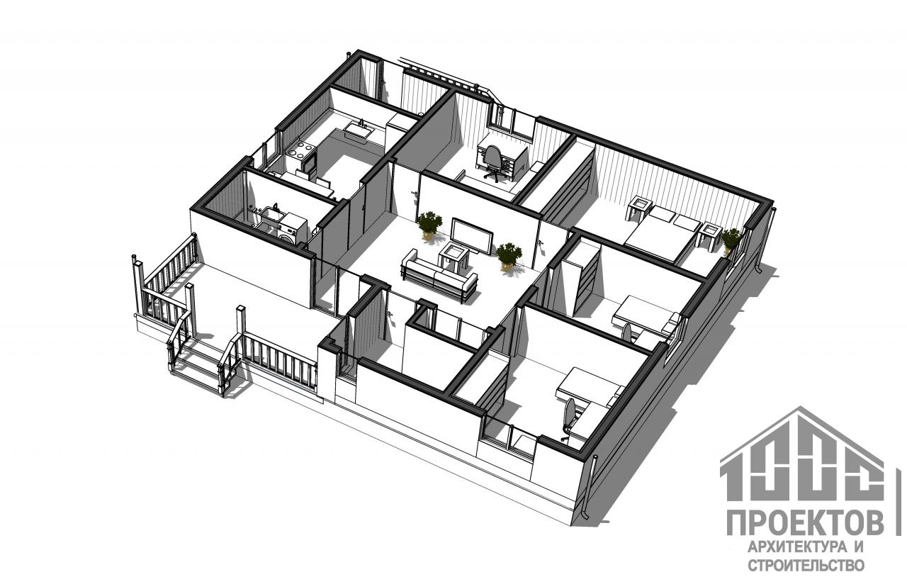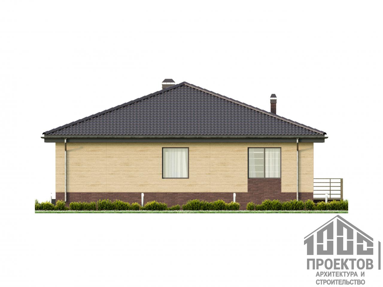 Одноэтажный жилой дом общей площадью 108,14 м2, в состав которой входит 84,12 м2 жилой площади. В нее включено 4 спальни и гостиная, которая еще выполняет и функцию прихожей. Таким образом удается сэкономить полезную площадь жилого дома. Для того что бы избежать ненужных шкафов и вешалок, которые будут только загромождать помешение, в гостиной предусмотрен гардероб. И даже несмотря на то что она является проходной комнатой, в ней есть место для удобного дивана и телевизора. Вход в топочную предусмотрен со двора, при необходимости можно перенести его в кухню. Этот жилой дом будет хорошим вариантом для многодетной семьи.