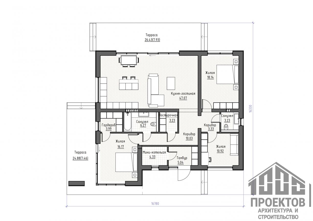 Это одноэтажный проект дома с плоской кровлей общей площадью 151,07м.кв. В проекте предусмотрено все необходимое для комфортного проживания.