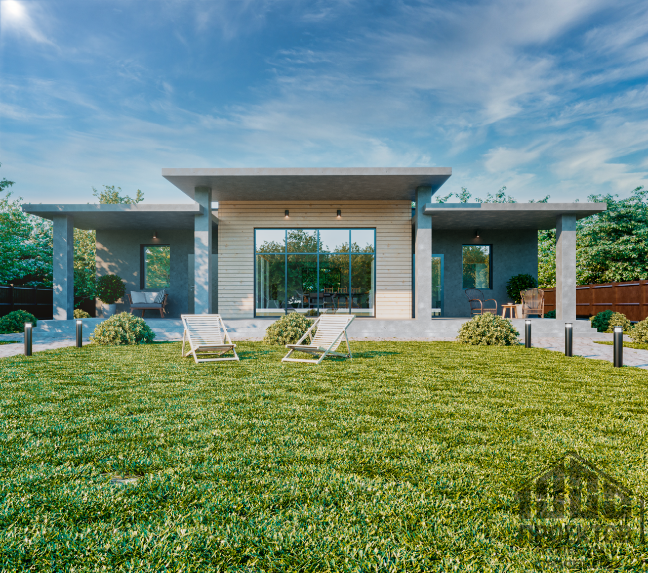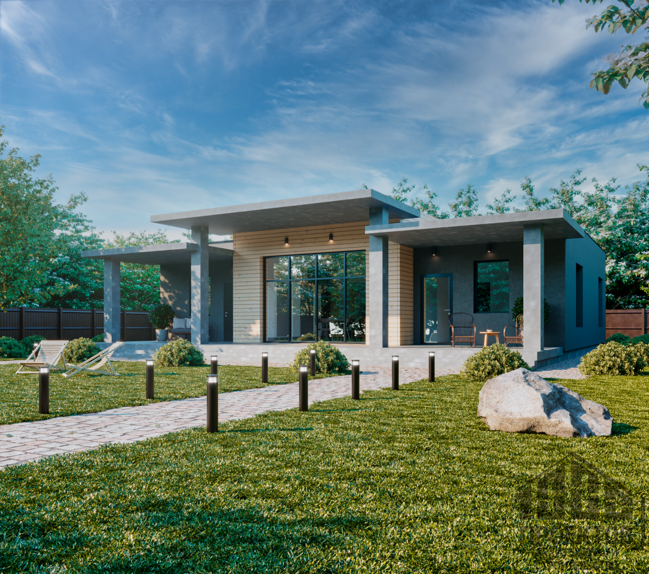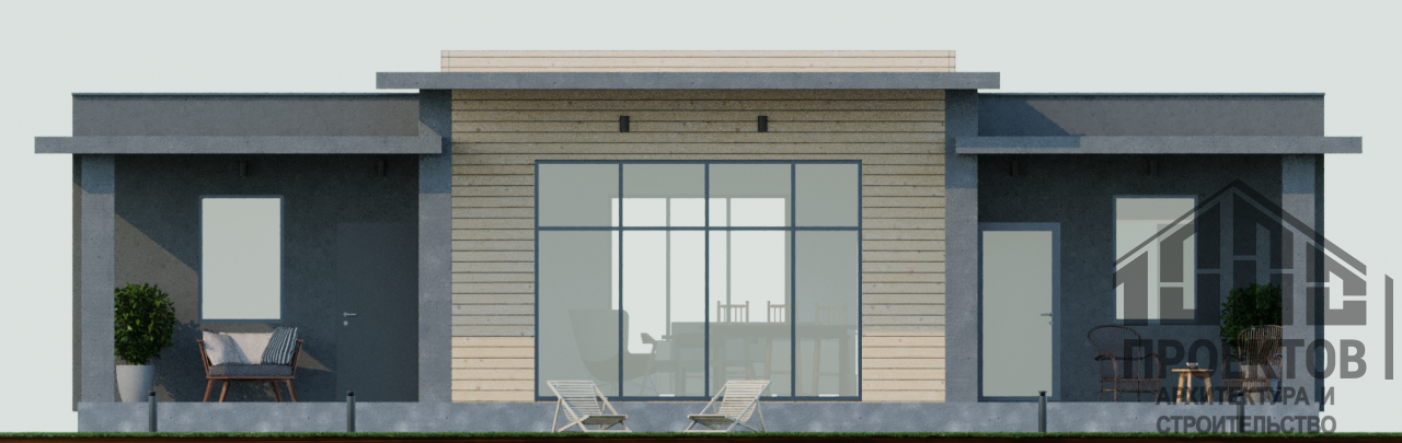 Проект одноэтажного дома из газосиликатных блоков площадью 165,93 м2. В проект включены 3 жилые комнаты, просторная гостиная, совмещенная с кухней, раздельный санузел, гардероб и уютная терраса.