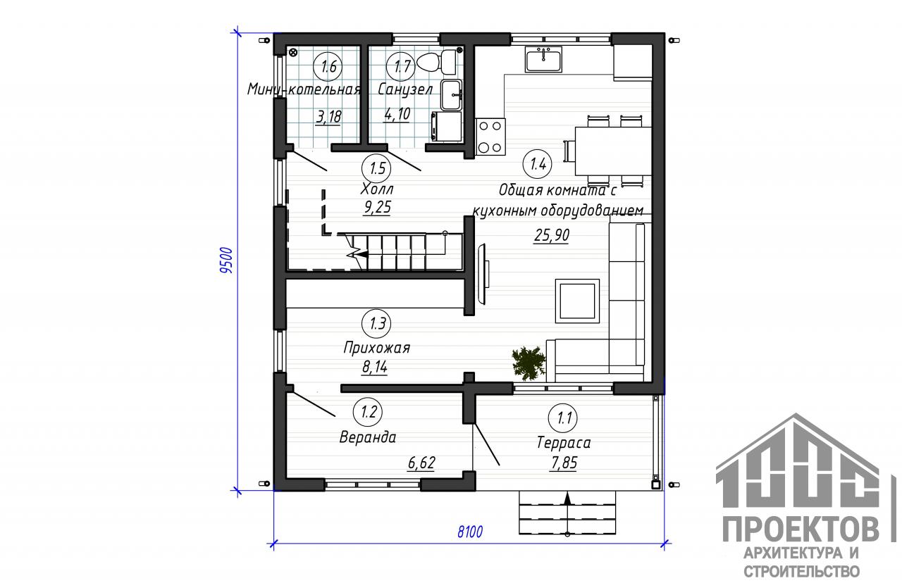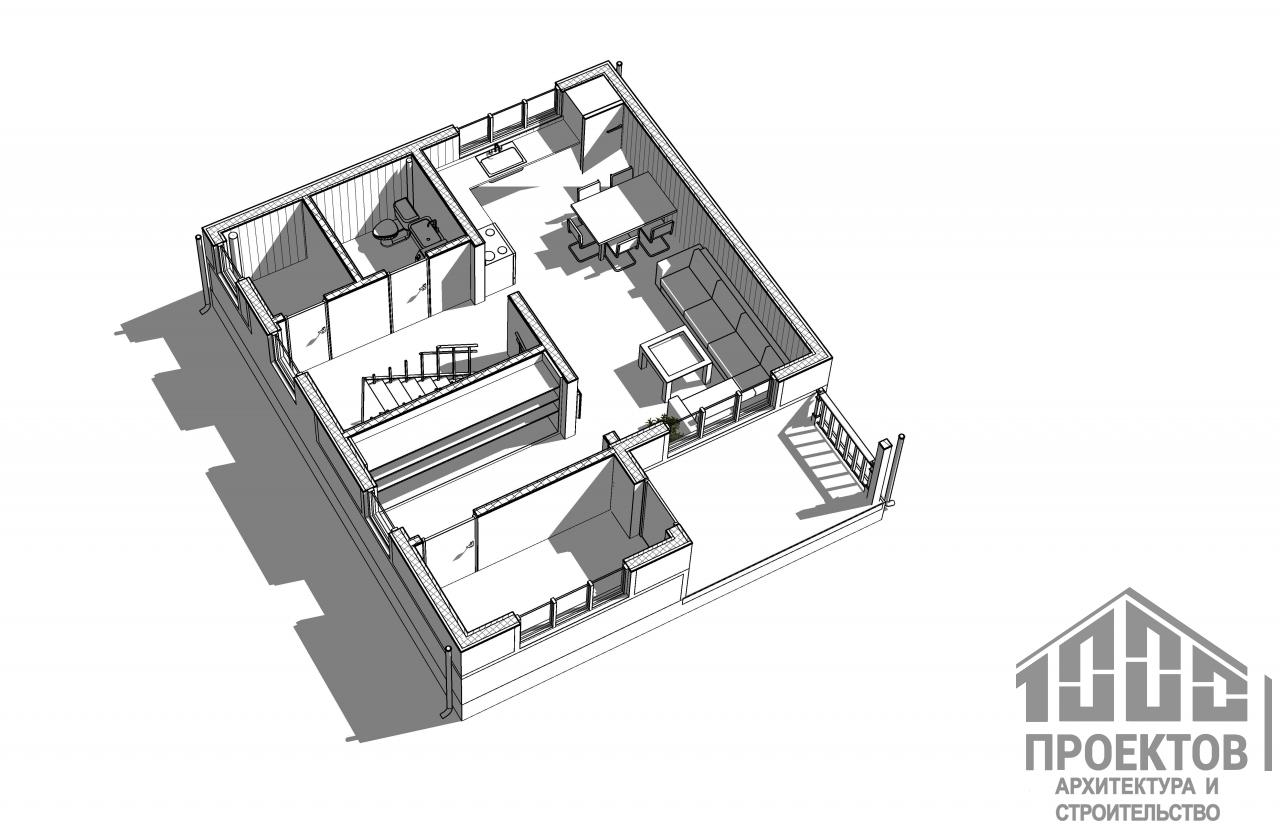 Проект каркасного жилого дома 1112 запроектирован одноэтажным с устройством мансардного этажа. Планировка данного жилого дома довольно простая, но максимально комфортная. Просторная освещенная прихожая - несомненный плюс. Более того в проекте имеется отдельный холл с лестницей на мансардный этаж. Кухня входит в состав общей комнаты. Мини-котельная, СУ и кухня расположены рядом, это упрощает устройство инженерных сетей. Мансарда - полностью жилой этаж. Все комнаты позволяют вместить всю необходимую для проживания даже многодетной семьи мебель. Для полного удобства на мансардном этаже предусмотрен большой санузел. Каркасный дом включает 64,9м2 жилой площади, 116,84м2 общей площади.