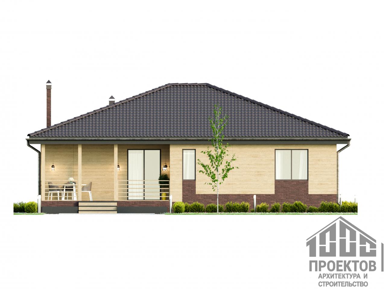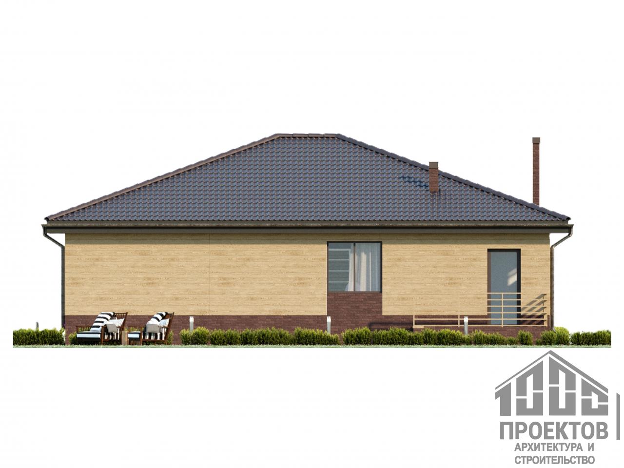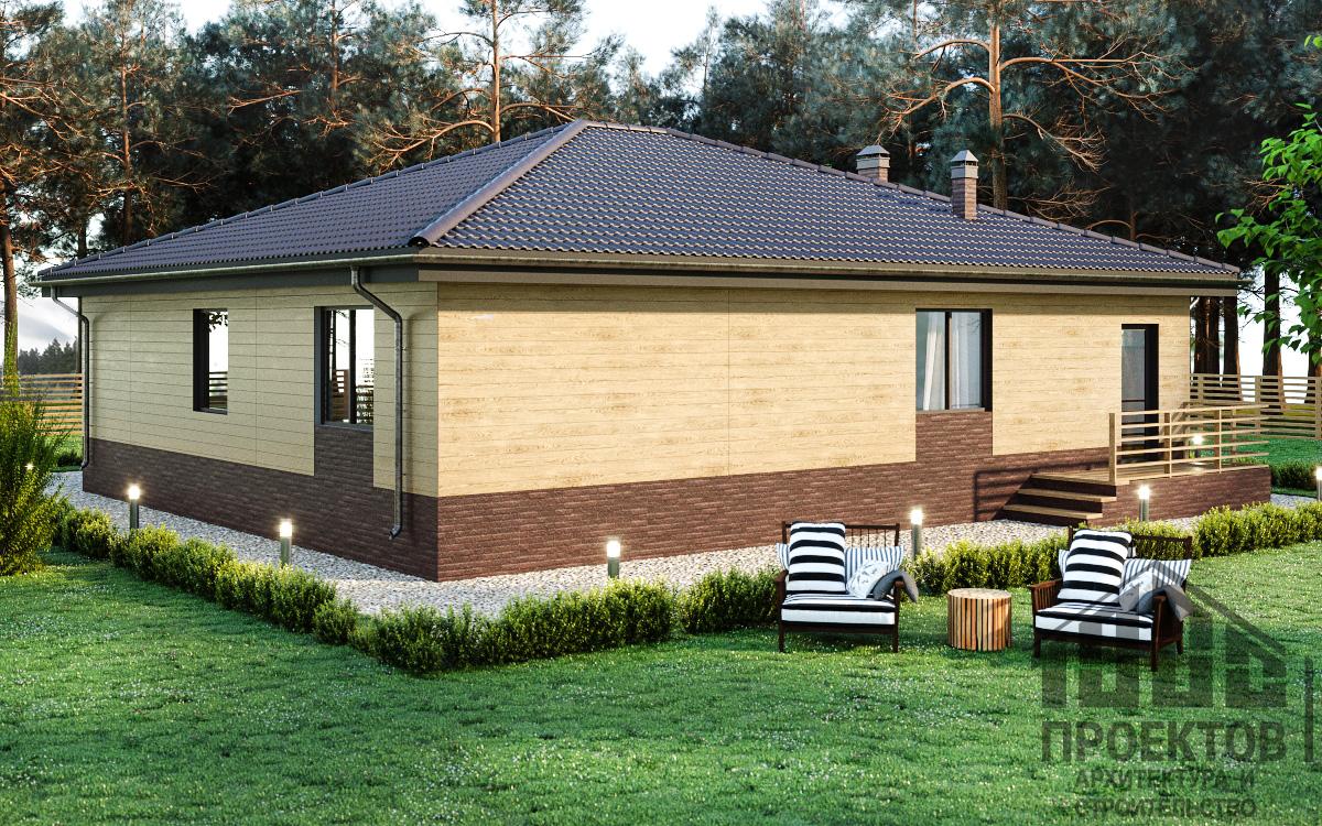 Одноэтажный жилой дом общей площадью 108,14 м2, в состав которой входит 84,12 м2 жилой площади. В нее включено 4 спальни и гостиная, которая еще выполняет и функцию прихожей. Таким образом удается сэкономить полезную площадь жилого дома. Для того что бы избежать ненужных шкафов и вешалок, которые будут только загромождать помешение, в гостиной предусмотрен гардероб. И даже несмотря на то что она является проходной комнатой, в ней есть место для удобного дивана и телевизора. Вход в топочную предусмотрен со двора, при необходимости можно перенести его в кухню. Этот жилой дом будет хорошим вариантом для многодетной семьи.