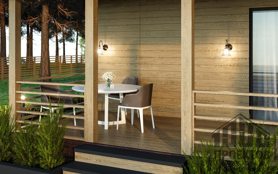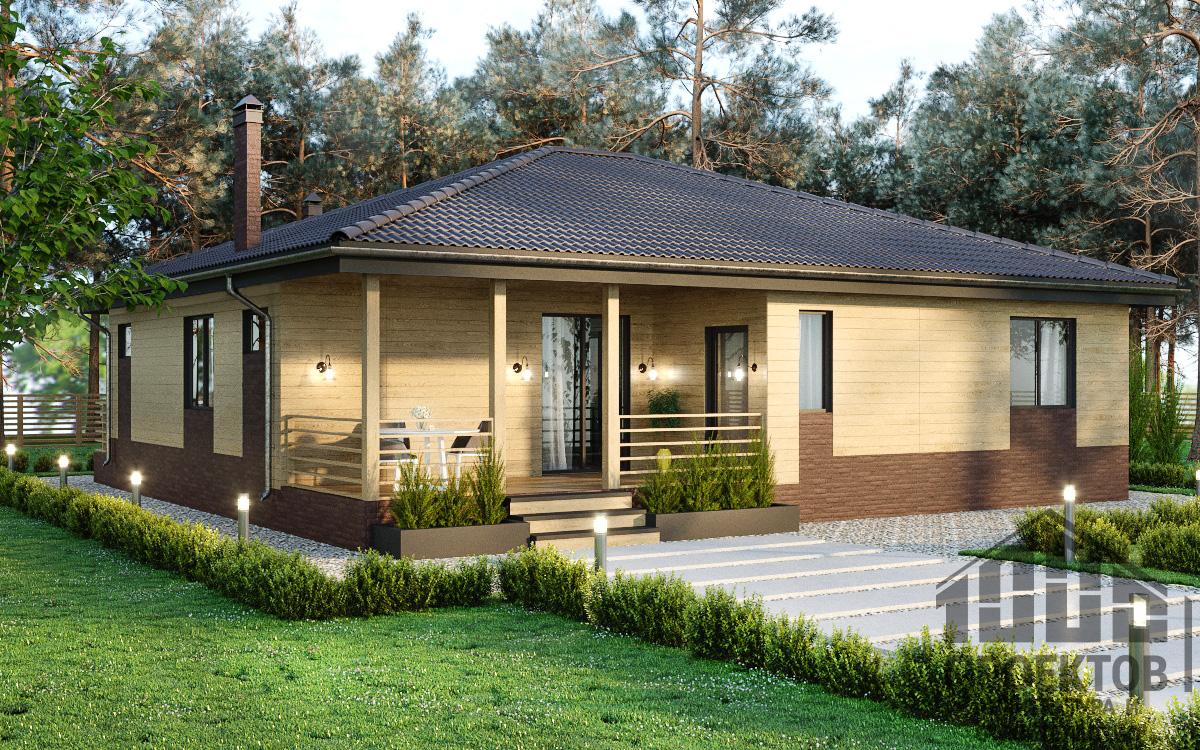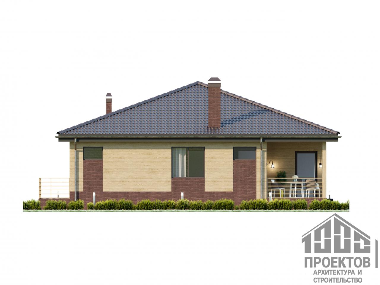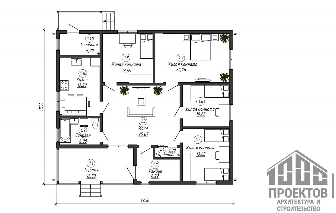 Одноэтажный жилой дом общей площадью 108,14 м2, в состав которой входит 84,12 м2 жилой площади. В нее включено 4 спальни и гостиная, которая еще выполняет и функцию прихожей. Таким образом удается сэкономить полезную площадь жилого дома. Для того что бы избежать ненужных шкафов и вешалок, которые будут только загромождать помешение, в гостиной предусмотрен гардероб. И даже несмотря на то что она является проходной комнатой, в ней есть место для удобного дивана и телевизора. Вход в топочную предусмотрен со двора, при необходимости можно перенести его в кухню. Этот жилой дом будет хорошим вариантом для многодетной семьи.