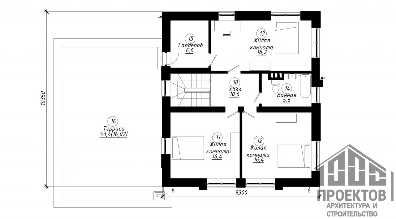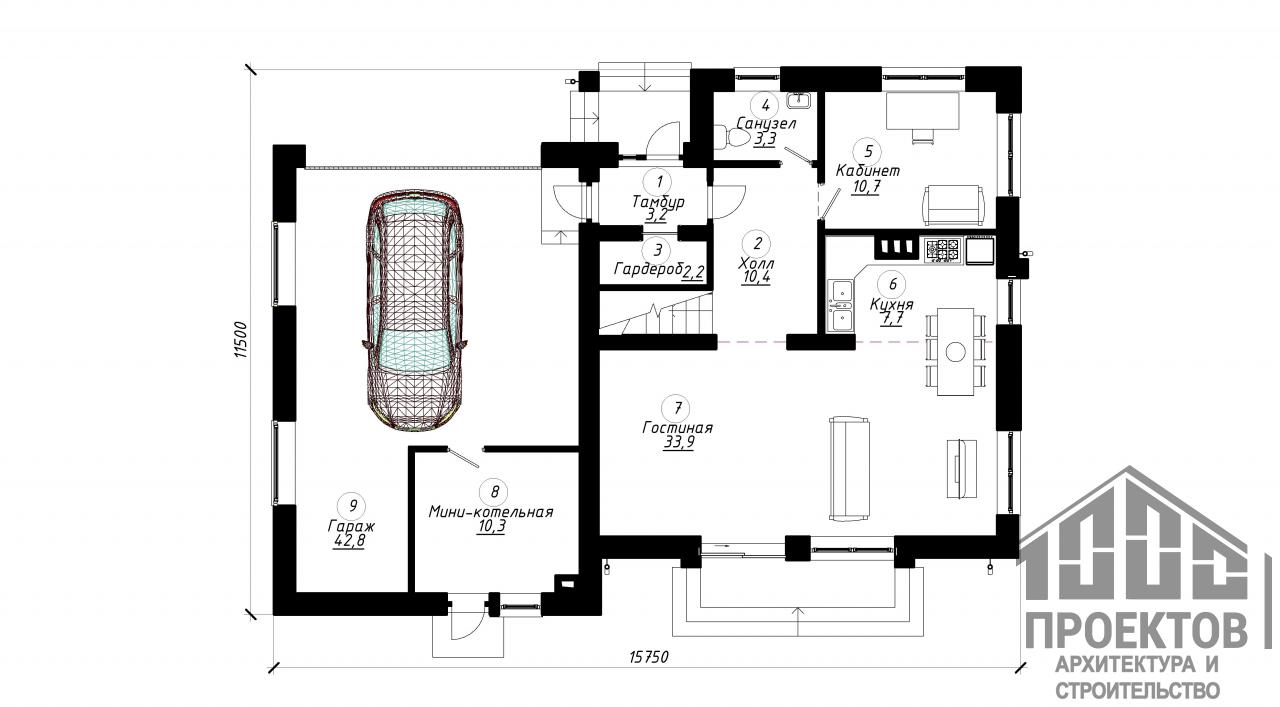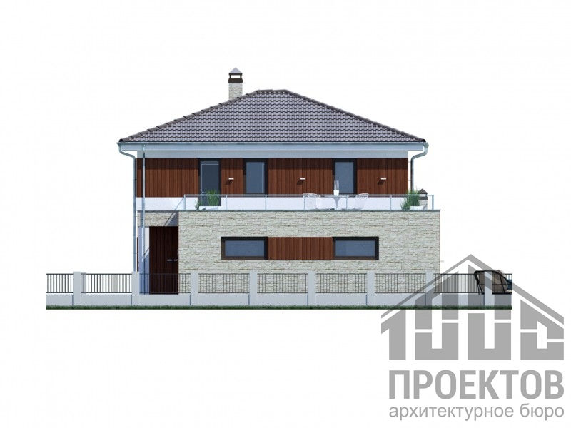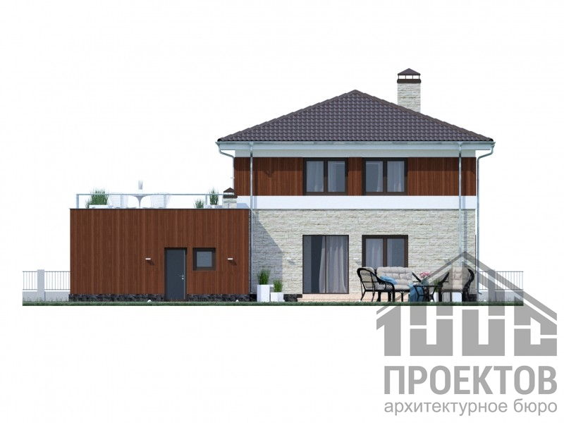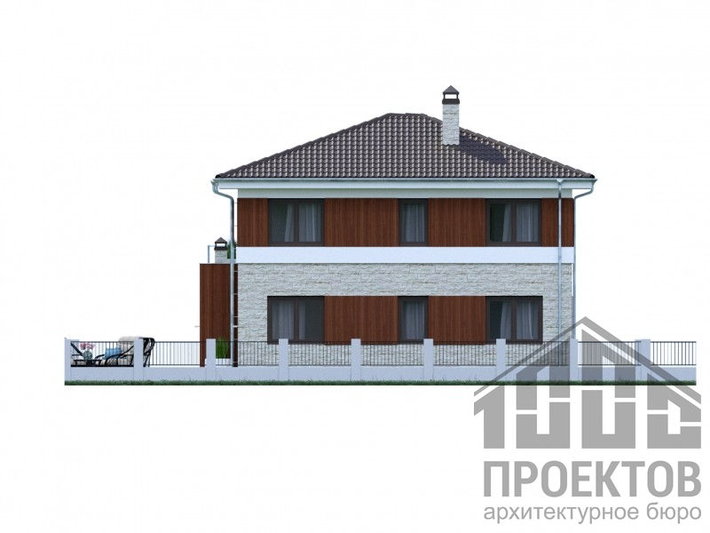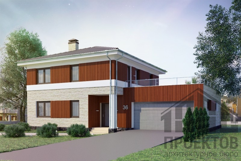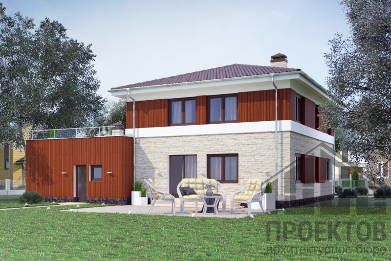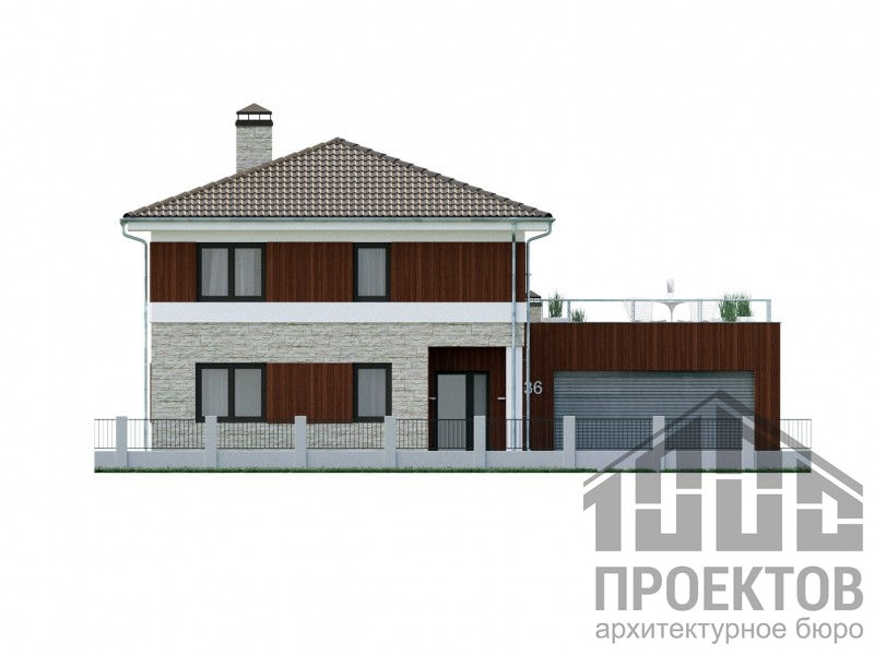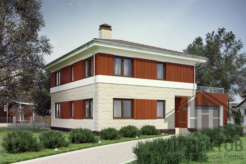Проект двухэтажного дома из газосиликатных блоков площадью 214,32 м2. На 1м этаже в проект включены большая гостиная, совмещенная с кухней, кабинет, гардеробная, санузел и гараж. На 2м этаже будут 3 жилые комнаты, гардеробная, санузел и терраса.
