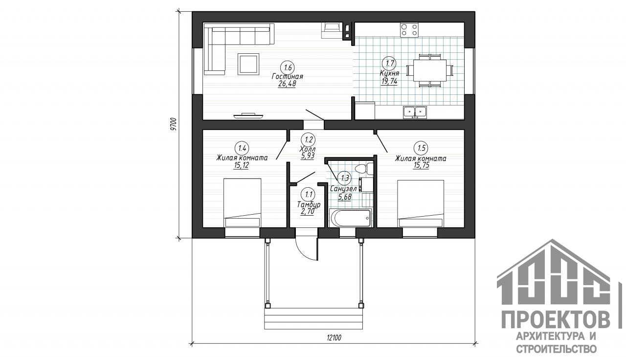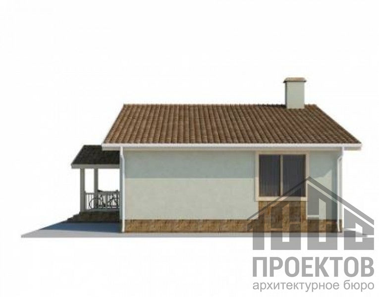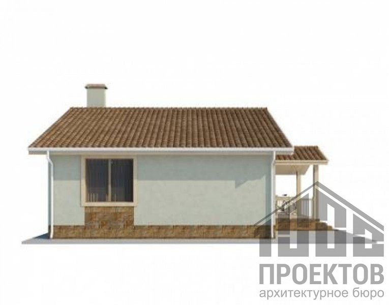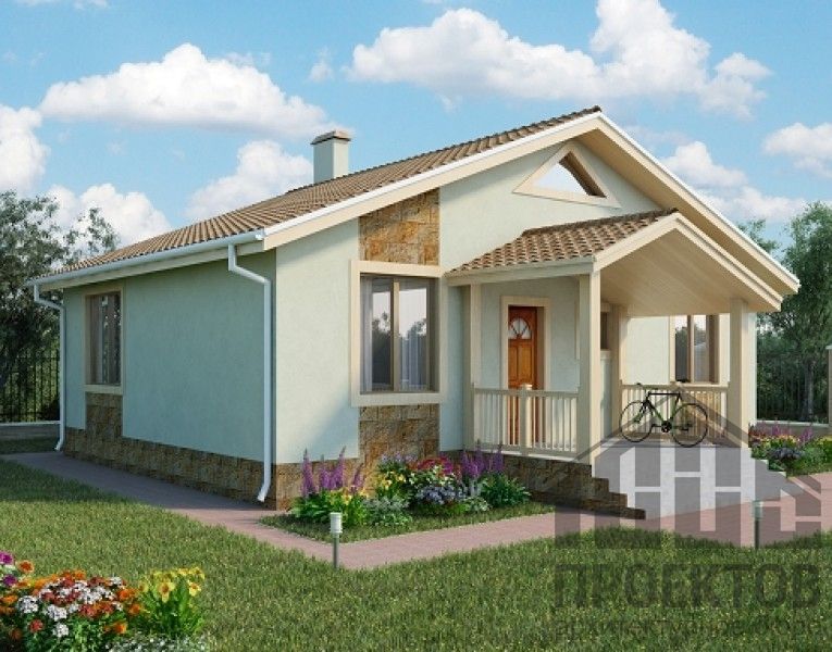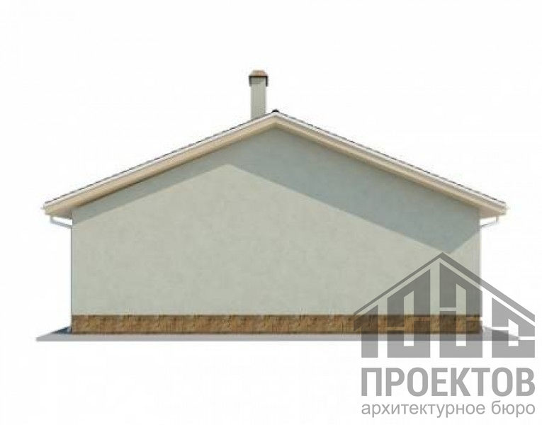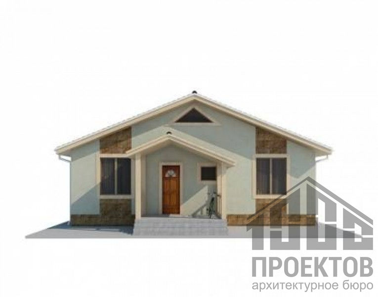 Проект одноэтажного дома из газосиликатных блоков площадью 91,4м2. В проект включены 2 жилых комнаты, гостиная, совмещенная с кухней и санузел.